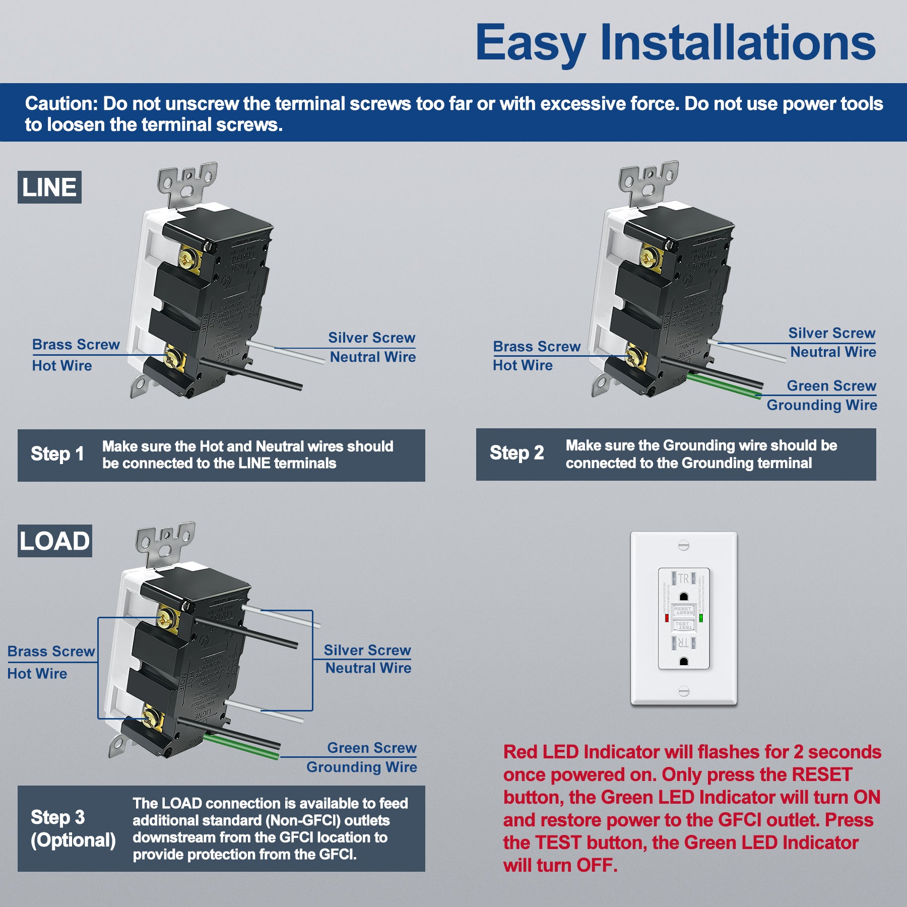 - 【Easy to Install】Easy Installation with back or side wiring. Wall plates, screws and installation instructions included. Caution: Do not unscrew the terminal screws too far or with excessive force. Do not use power tools to loosen the terminal screws.